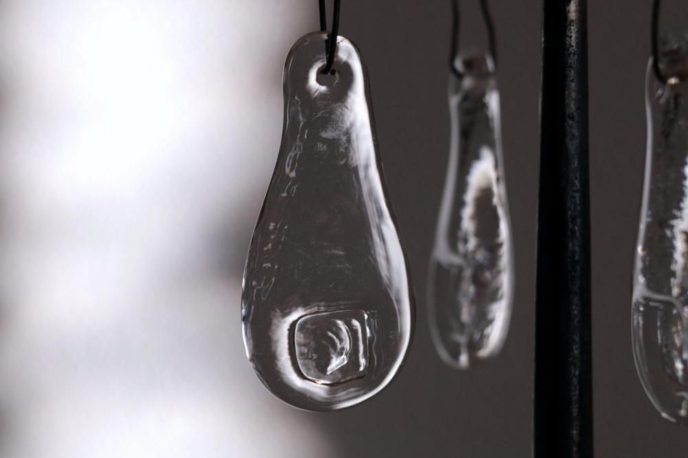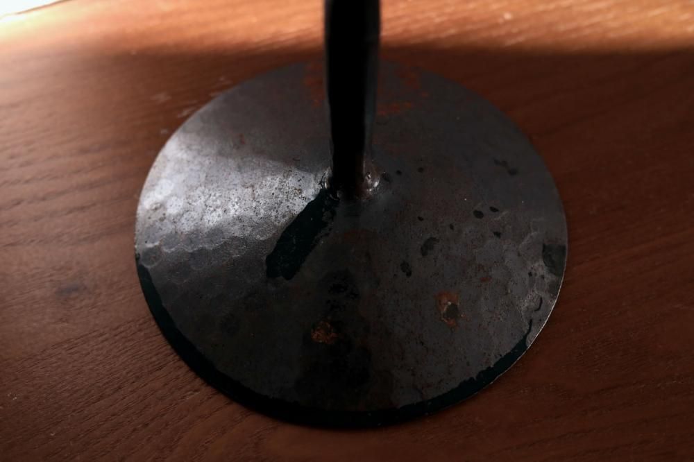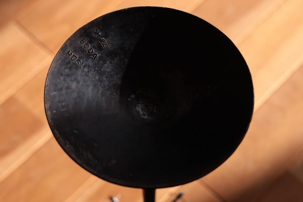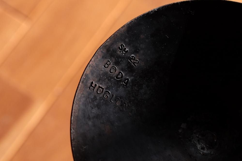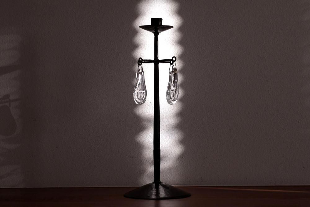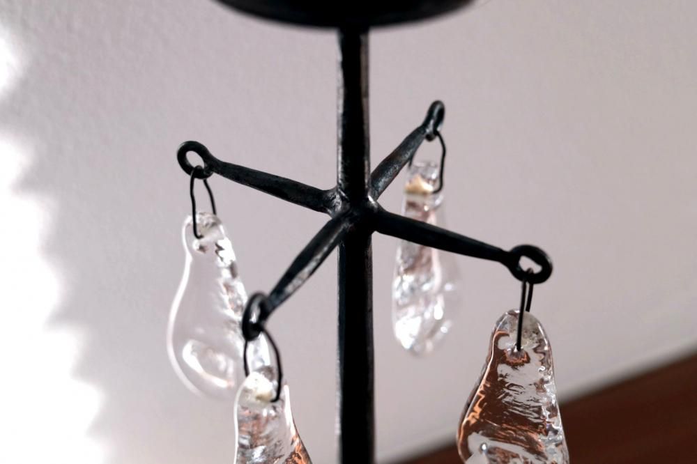 4つの細長いガラスオーナメントが吊り下げられているSH22モデルのキャンドルスタンド。ガラスも美しいですが、アイアンの形状の美しさにも目を奪われます。底部裏側に"SH22 BODA HOGLUND"の刻印が入っています(画像8)。*オーナメントに押されている型は全て女性の横顔の型です。
