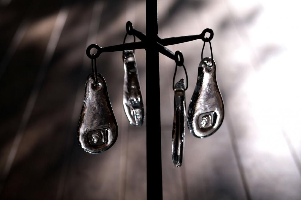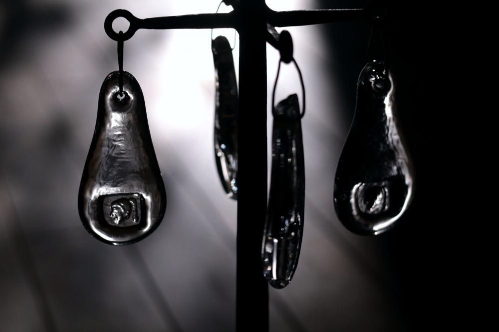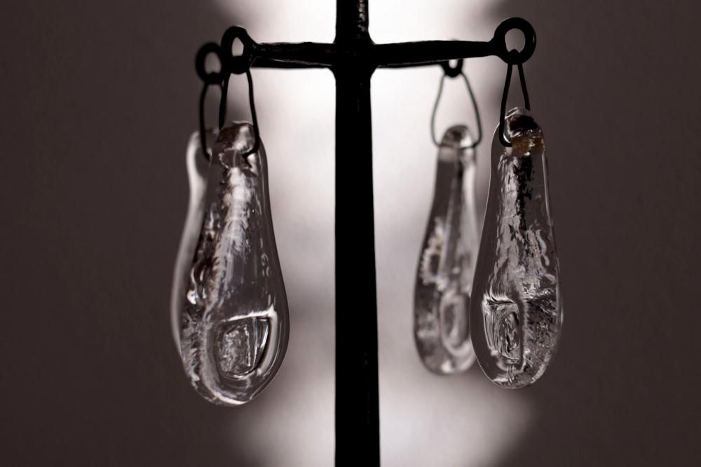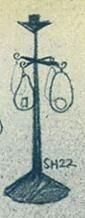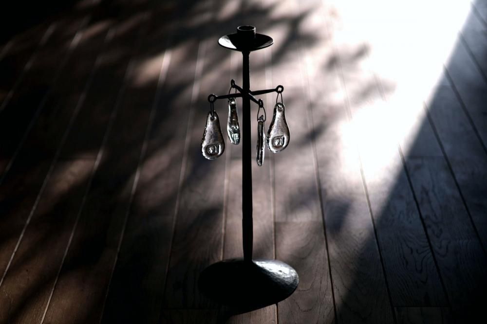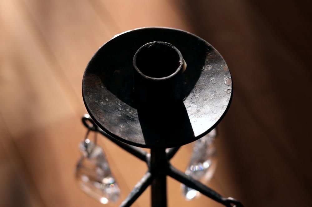 4つの細長いガラスオーナメントが吊り下げられているSH22モデルのキャンドルスタンド。ガラスも美しいですが、アイアンの形状の美しさにも目を奪われます。底部裏側に"SH22 BODA HOGLUND"の刻印が入っています(画像8)。*オーナメントに押されている型は全て女性の横顔の型です。
