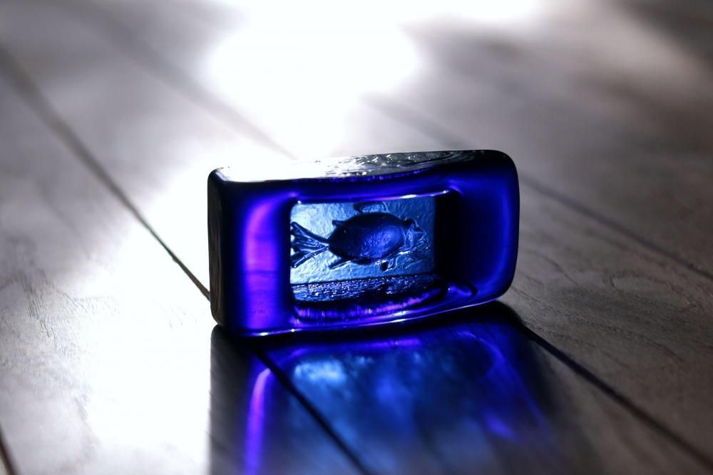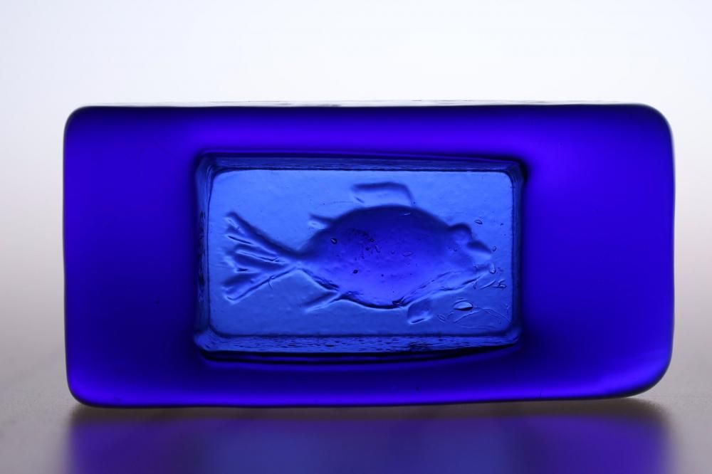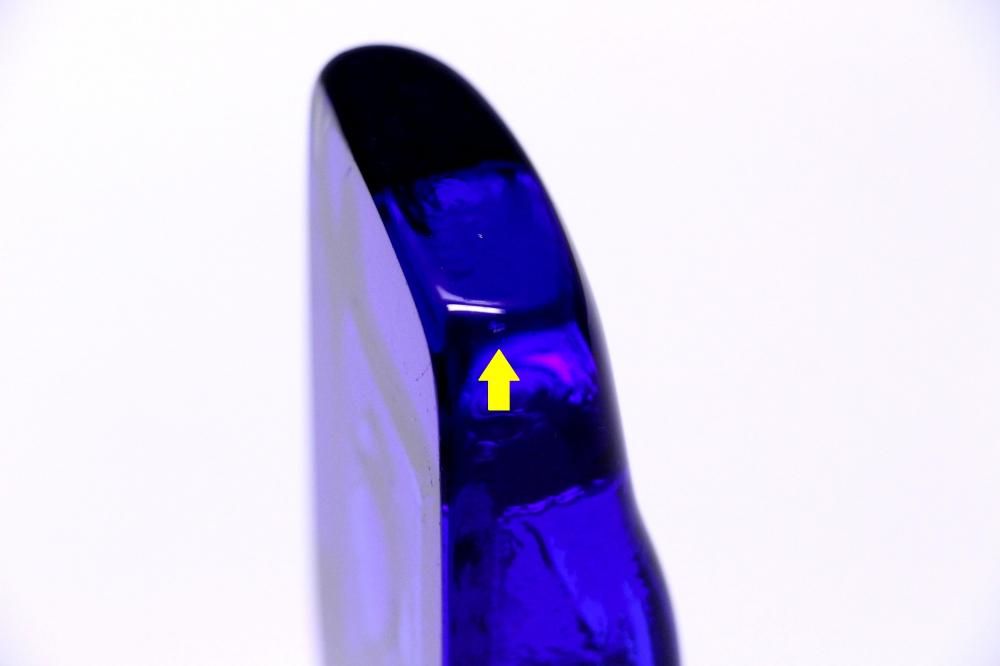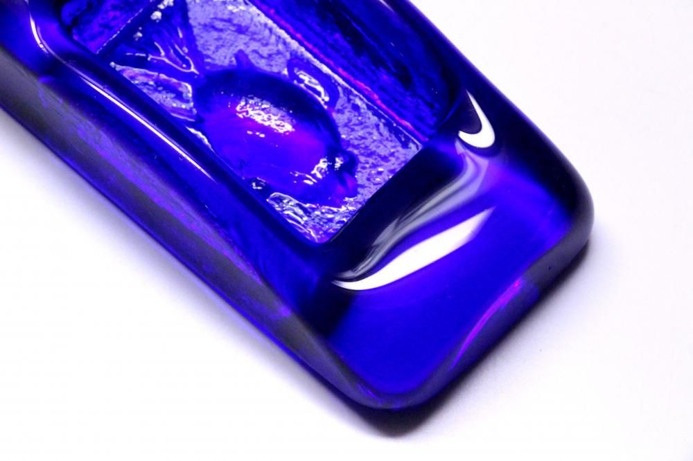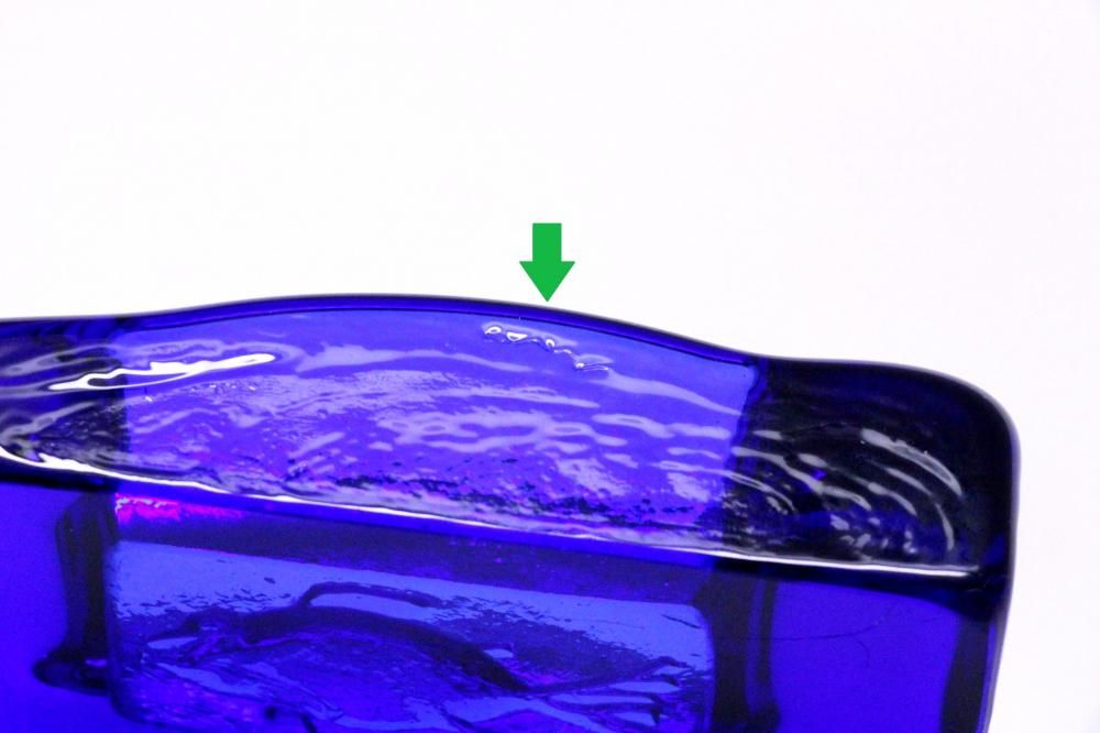 コンディション:表面は、多少の擦れはありますが概ね綺麗です。側面に1か所小さな打ちキズがありますが、あまり目立たない程度です(画像6)。また、複数の小さな凹みがありますが、製造過程で出来たものです(画像7)。裏面は、擦れがやや目立ちます。全体としましては、概ね良いコンディションです。ガラス制作上特有の歪み、しわ、くぼみ、気泡の割れ等がある場合がございますのでご理解頂ければと思います。*画像で紫色に見える部分がありますが光の影響です。実際には青一色です。