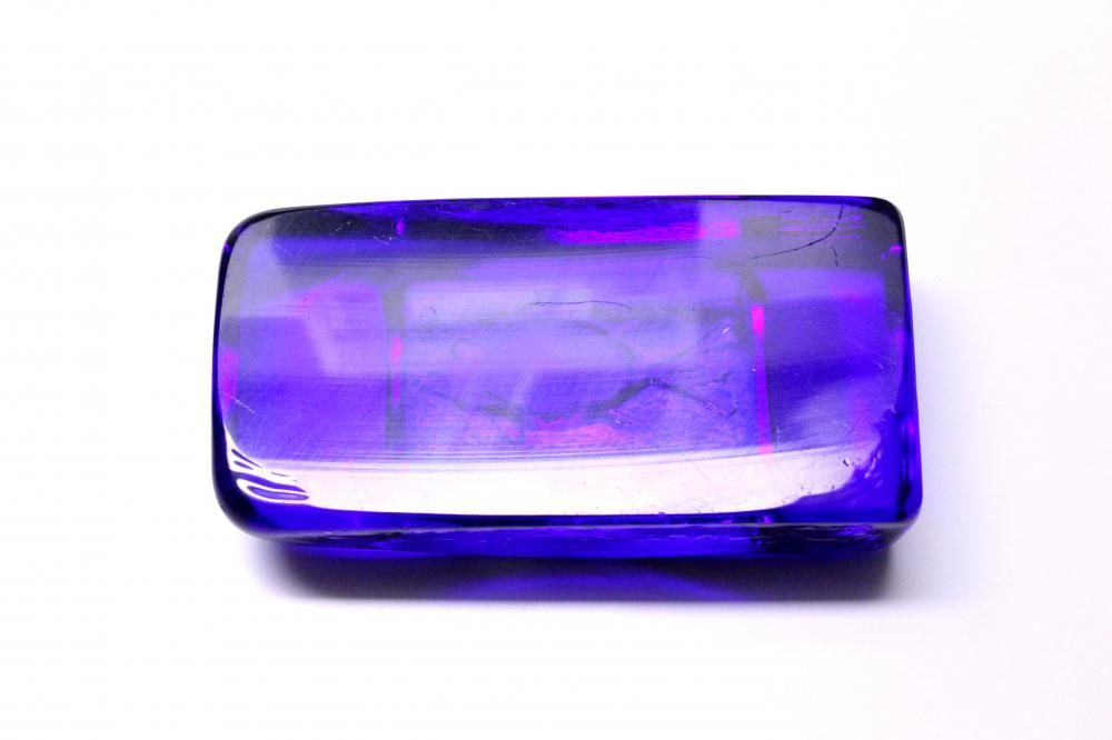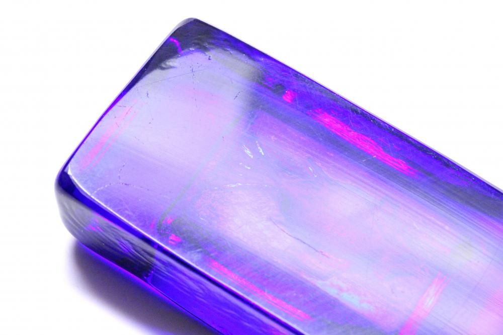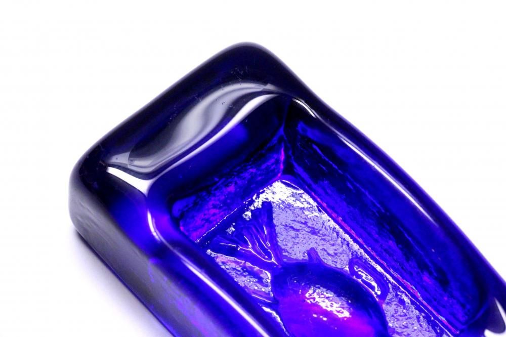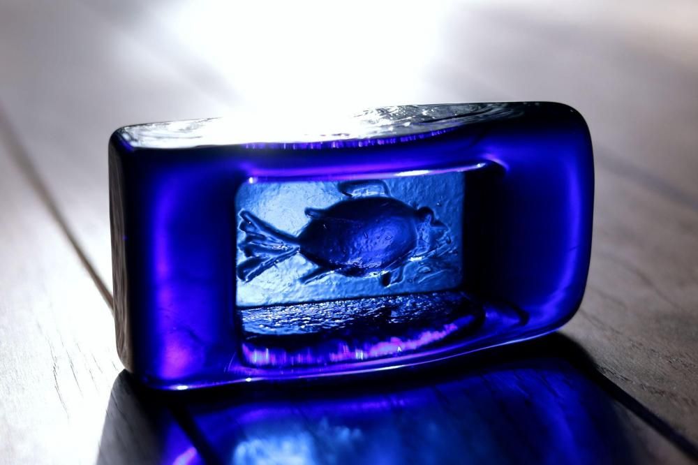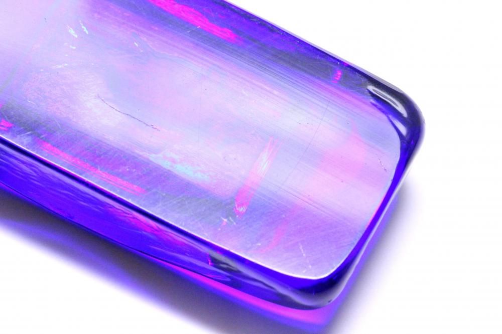 コンディション:表面は、多少の擦れはありますが概ね綺麗です。側面に1か所小さな打ちキズがありますが、あまり目立たない程度です(画像6)。また、複数の小さな凹みがありますが、製造過程で出来たものです(画像7)。裏面は、擦れがやや目立ちます。全体としましては、概ね良いコンディションです。ガラス制作上特有の歪み、しわ、くぼみ、気泡の割れ等がある場合がございますのでご理解頂ければと思います。*画像で紫色に見える部分がありますが光の影響です。実際には青一色です。