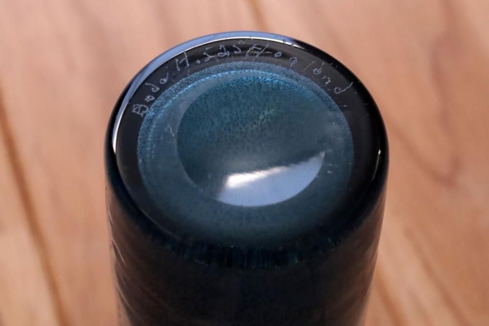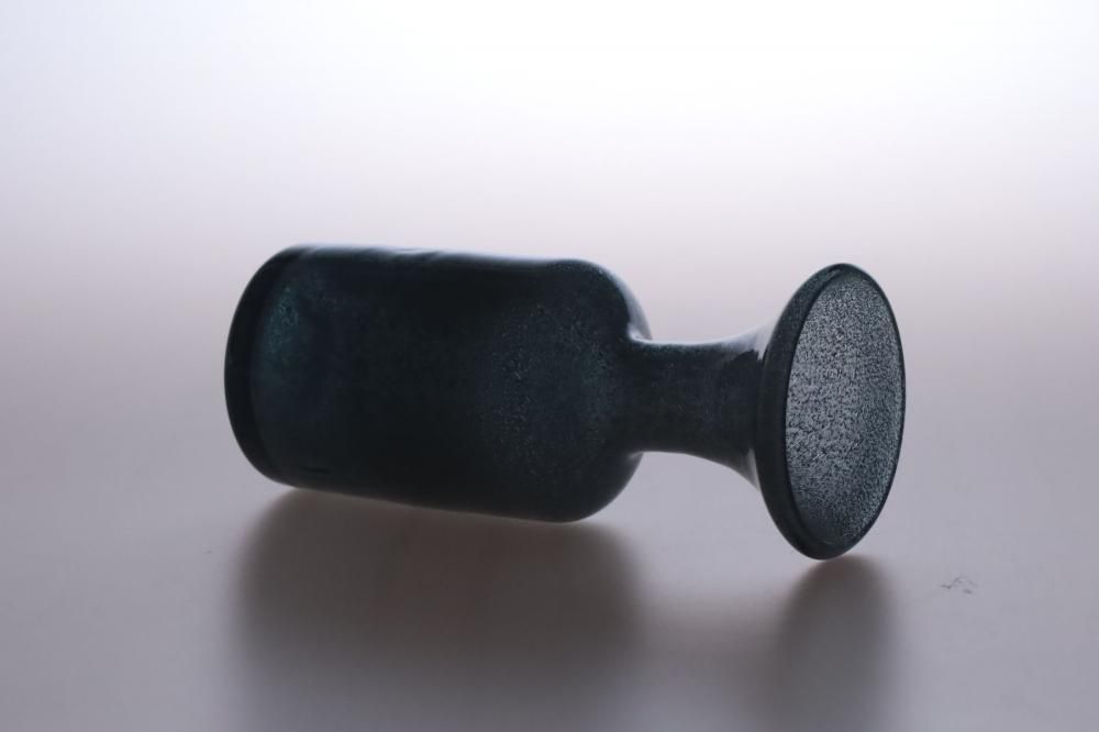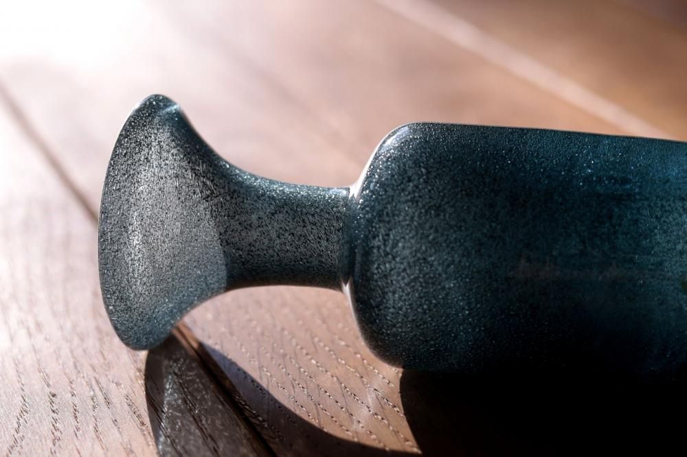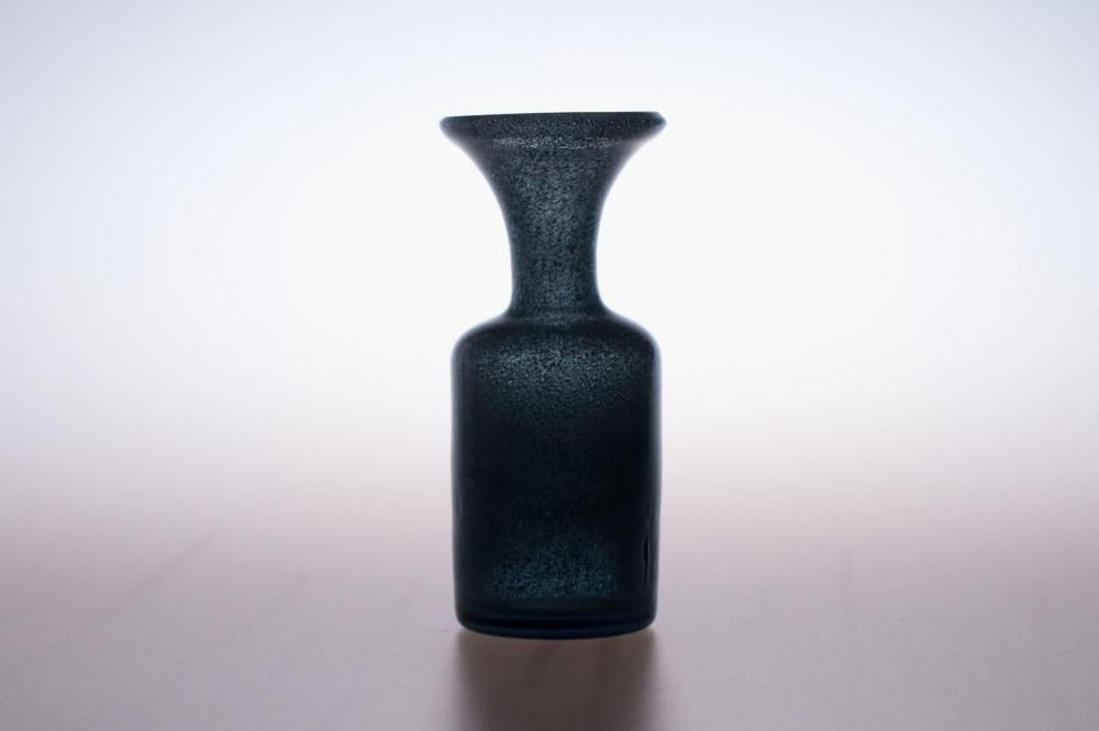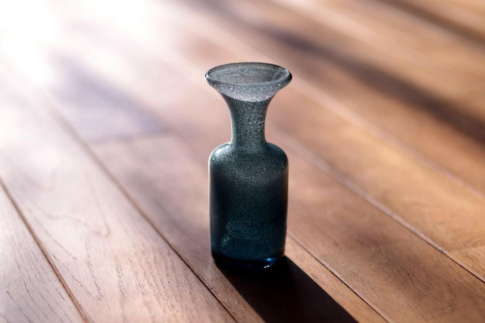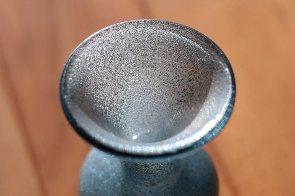 細かな気泡が美しいブルーグレーのフラワーベース。底部にカットサインが入っています(画像9)。