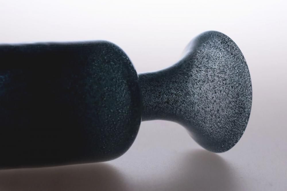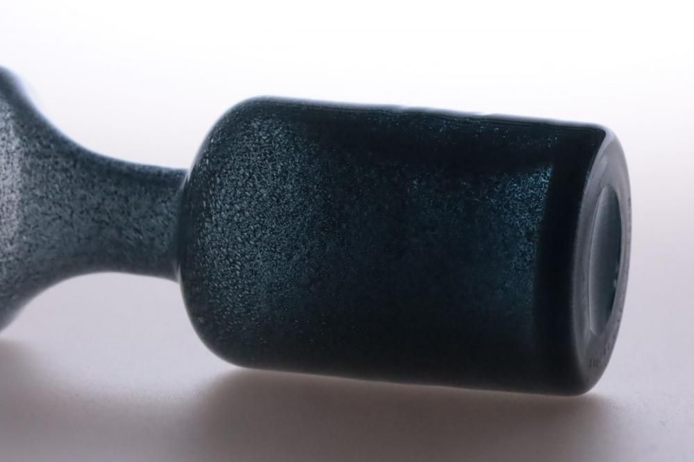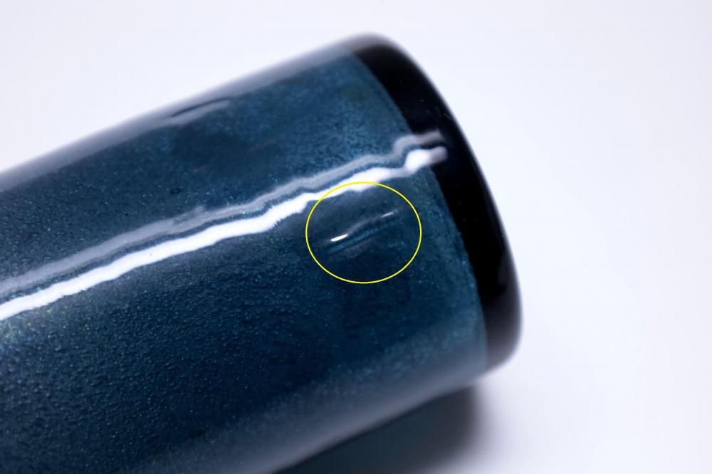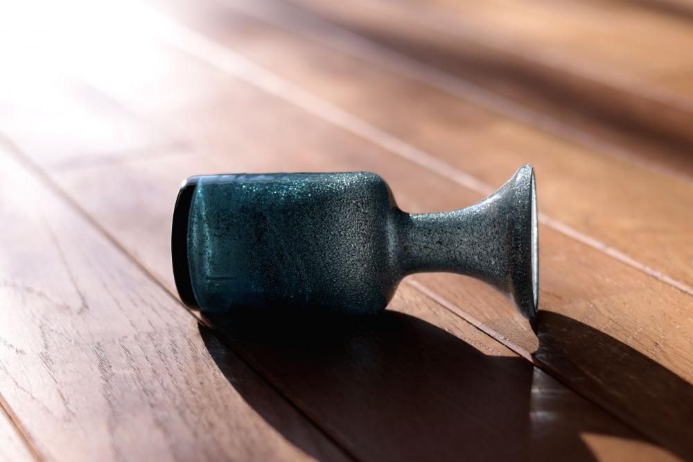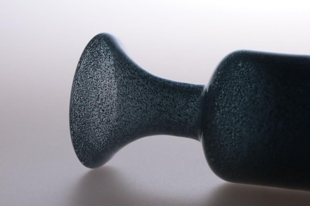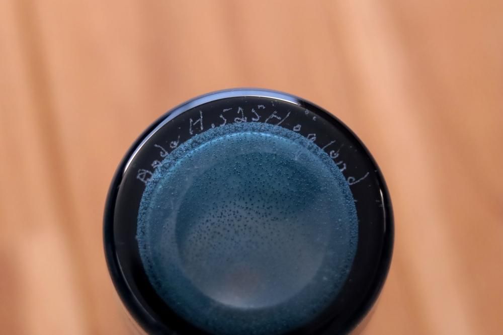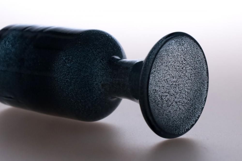 細かな気泡が美しいブルーグレーのフラワーベース。底部にカットサインが入っています(画像9)。